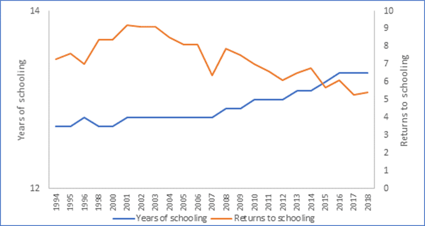 - Returns to schooling increased from 7 percent in 1994 to 9.1 percent in 2001. However, returns averaged only 6.3 percent between 2008 and 2018, which was among the lowest worldwide, and by 2018, they had fallen to 5.4 percent.