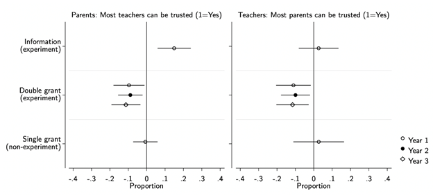 What might explain the divergent results between providing information and providing grants to parent associations? Parental involvement programs rely on the formation of successful social ties between parents and teachers to collectively support the needs of children. A large body of theoretical and empirical research suggests that trust is a core component of social capital (Putnam 2001) and the absence of trust severely hampers transactions between actors (Fehr 2009). In Figure 1, we show how each of the interventions altered trust between parents and teachers.