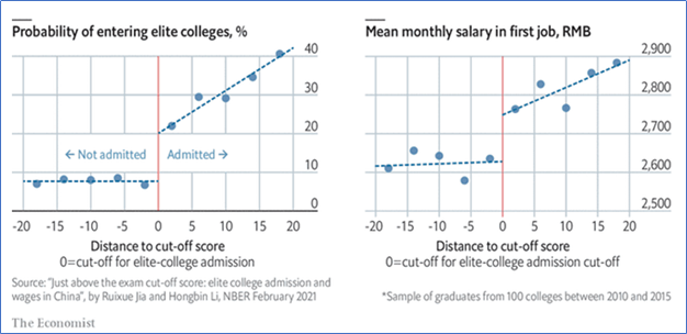 The benefits of acing China’s most important academic exam | High scorers in China’s university entrance exam (gaokao; 高考) go to better universities and earn higher wages (The Economist summary of the NBER working paper).