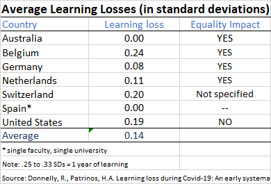 Since the systematic review was written, several new studies have been undertaken, documenting losses in learning between 0.08 and 0.32 standard deviations. Theses include: Brazil, China, the Czech Republic, England, Germany, Ghana, Italy (and for higher education), Norway, and Russia, among others. Little to no learning losses have been detected in Denmark, France and Japan.