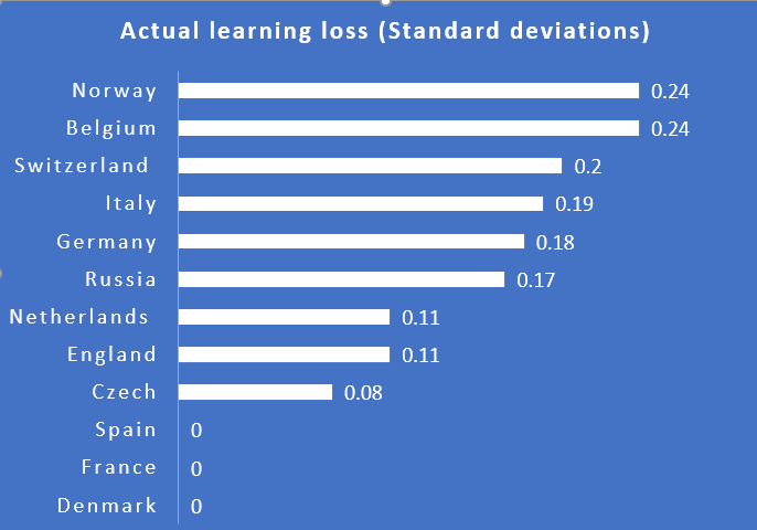 In Europe, 10 of 13 countries report learning loss amongst at least some students. COVD-19 education closures resulted in actual student learning losses, equivalent to about 1/3 of a year’s worth of learning. Learning losses disproportionately affect those from poorer socioeconomic backgrounds.