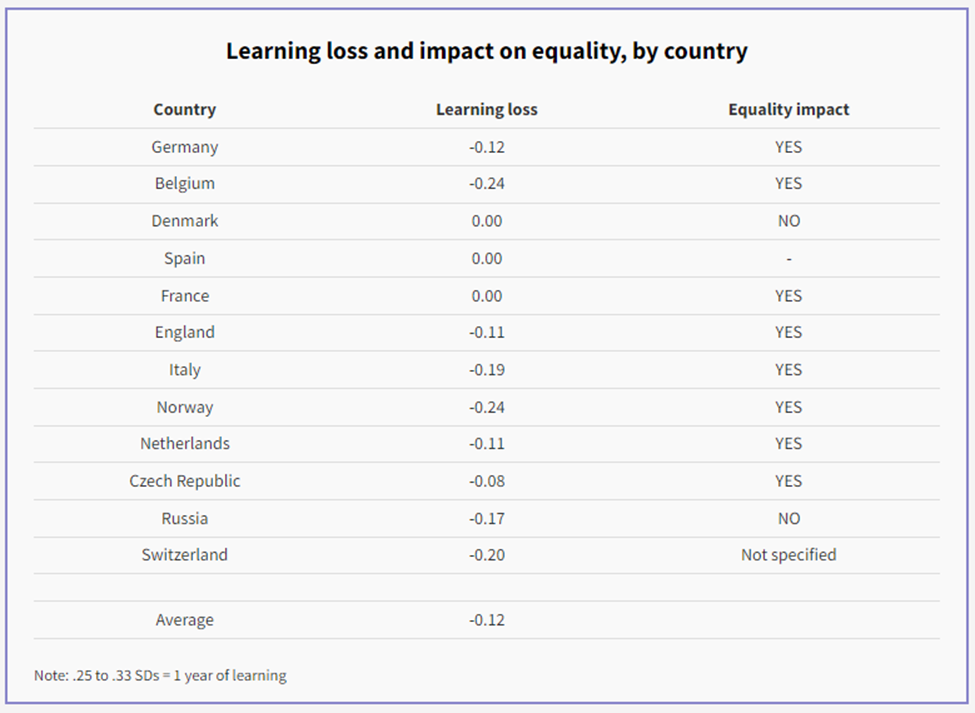 So far, we have evidence of actual learning losses from only a handful of countries across Europe. Early results from Belgium, the Czech Republic, Germany, the Netherlands, Norway, Russia, Switzerland, and the United Kingdom have shown both learning losses. These losses are found to be much higher among students from less-educated homes.