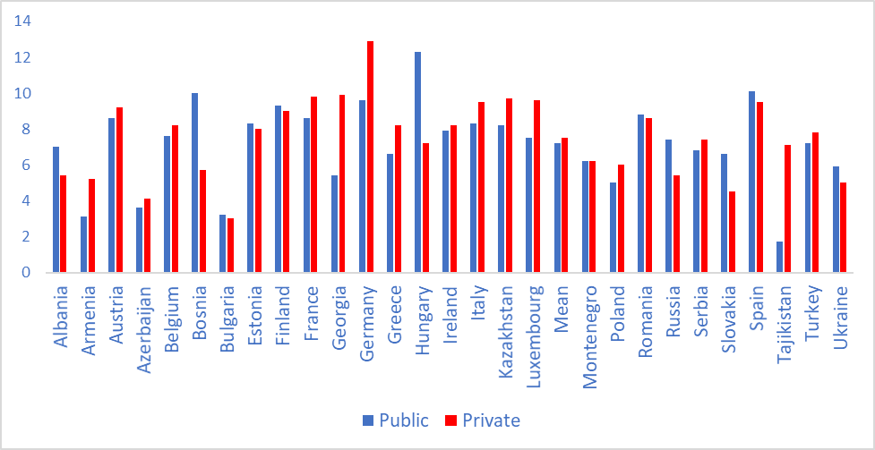The public sector pays on the average more than the private sector. The unadjusted wage differential is 14 percent higher in the public sector. On average, most workers are employed in the private sector, at 67 percent, but there are a few countries where the public sector dominates.