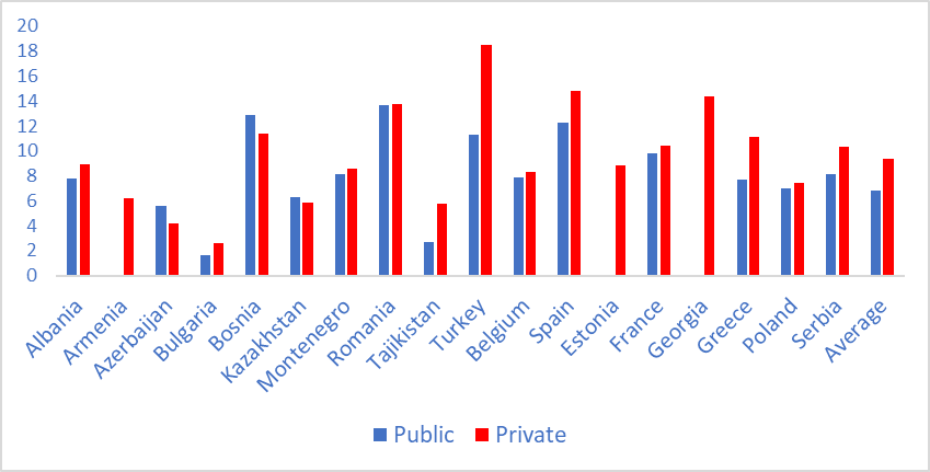 The public sector pays on the average more than the private sector. The unadjusted wage differential is 14 percent higher in the public sector. On average, most workers are employed in the private sector, at 67 percent, but there are a few countries where the public sector dominates.
