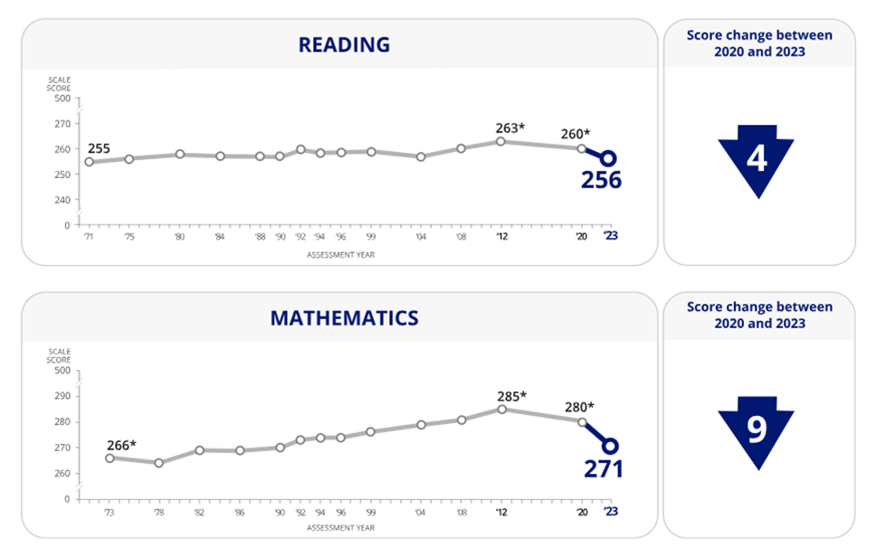 In the USA, Scores Continue to Decline for 13-year old Students in Reading and Mathematics | The National Center for Education Statistics (NCES) administered the NAEP long-term trend reading and mathematics assessments to 13-year-old students from October to December of the 2022–23 school year. The average scores for 13-year-olds declined 4 points in reading and 9 points in mathematics compared to the previous assessment administered during the 2019–20 school year. Compared to a decade ago, the average scores declined 7 points in reading and 14 points in mathematics. These are large losses given the standard deviation of such tests.