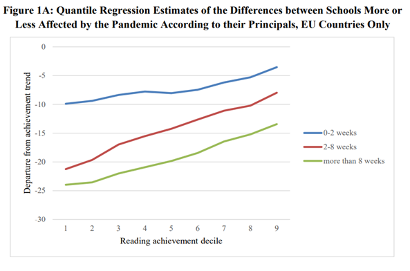 Global Learning Loss in Student Achievement: First Estimates using Comparable Reading Scores | Jakubowski, Gajderowicz, Patrinos | COVID-related educational loss equals more than a year of schooling. Learning losses are larger for those who faced relatively longer school closures. Lower-achieving students experienced much larger educational losses. The global impact of COVID-19 on student reading is assessed using comparable, international achievement tests (PIRLS). The effect of school closures (full and partial) on achievement is modeled by predicting the deviation of the most recent results from a linear trend using data from all rounds. Scores declined an average of 33 percent of a standard deviation, equivalent to more than a year of schooling.
