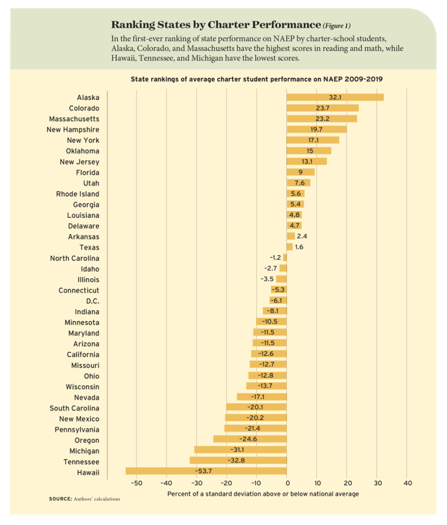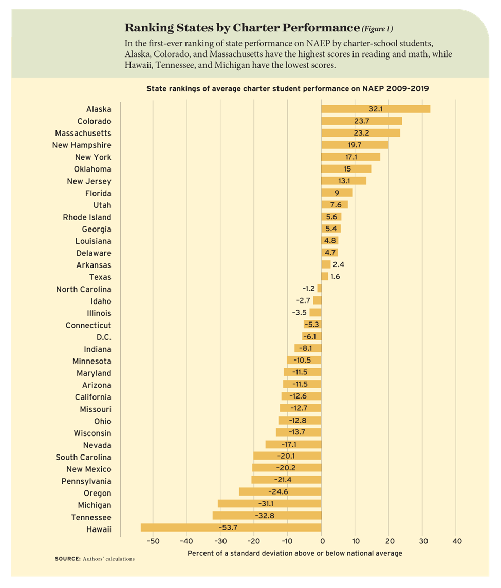 The Nation’s Charter Report Card | Peterson, Shakeel | First-ever state ranking of charter student performance on the National Assessment of Educational Progress, based on student performance in reading and math on the National Assessment of Educational Progress (NAEP), between 2009 and 2019. These rankings, created at Harvard University, are adjusted for the age of the charter school and for individual students’ background characteristics. They are based on representative samples of charter-school students in grades 4 and 8 and cover 35 states and Washington, D.C. They also estimate the association between student achievement and various charter laws and characteristics. (See also published article.)
