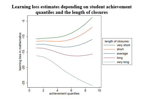 Further analysis shows differences in learning losses based on achievement levels and country-specific closure lengths. In countries with average closures, learning loss is similar across low-, average-, and high-achieving students. However, in countries with shorter closures, top students experienced minimal loss, while average- and low-achieving students saw declines. In nations with longer closures, the best students faced larger learning losses. Those with the longest closures saw low-achieving students lose 16-17 points (20% of a standard deviation), while top achievers lost 25 points or more (29% of a standard deviation).